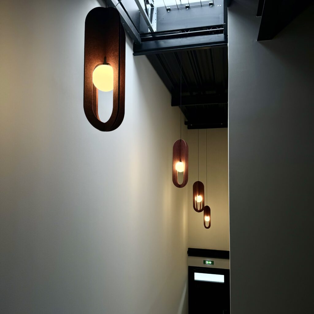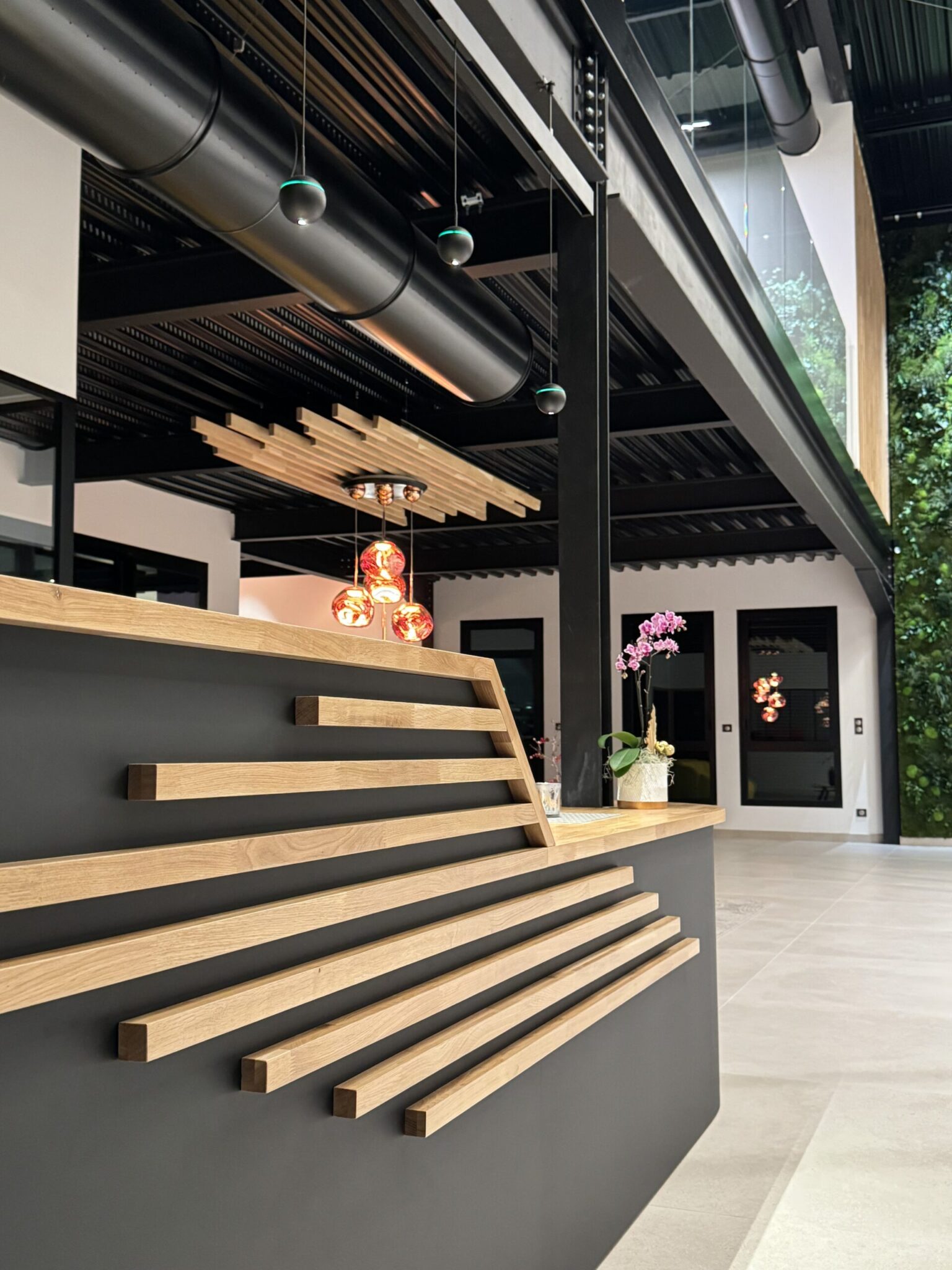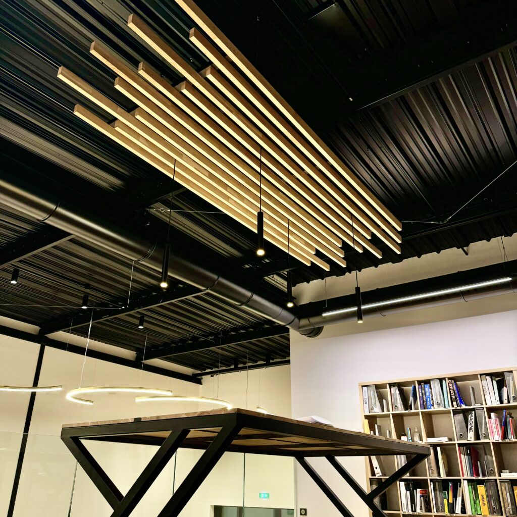 Au premier étage, le plafond en métal noir confère une esthétique industrielle tandis que les éléments en bois ajoutent une touche naturelle, créant un contraste de style. Les luminaires en bois sur mesure, conçus spécifiquement pour chaque espace, apportent un éclairage subtile et personnalisé à cette réalisation.