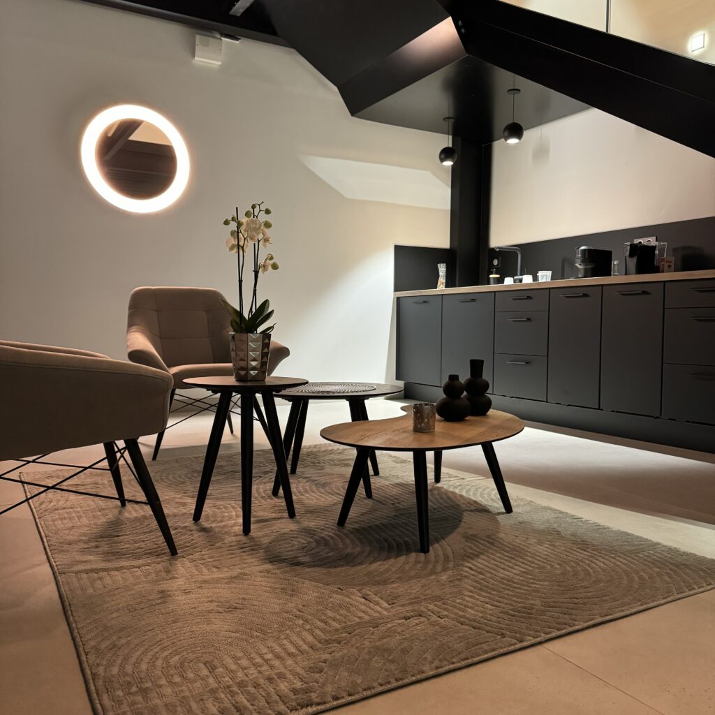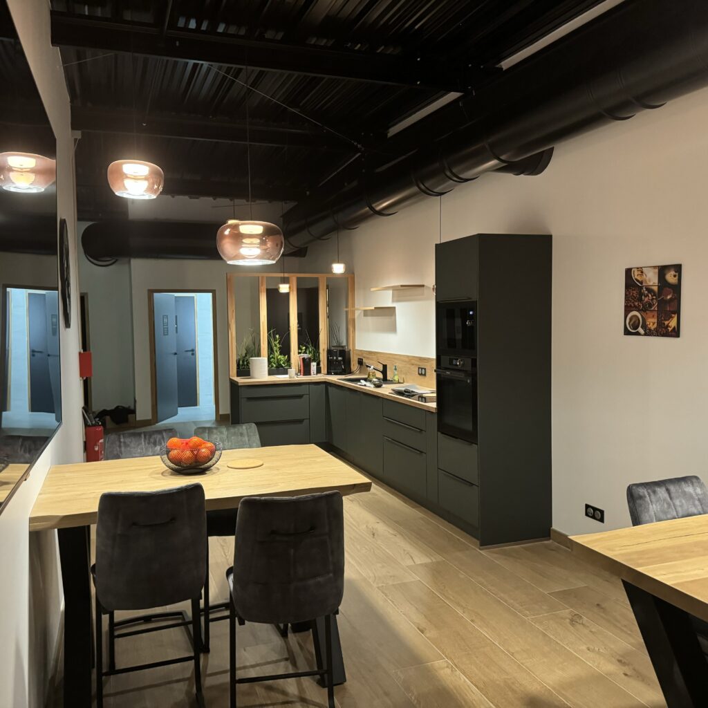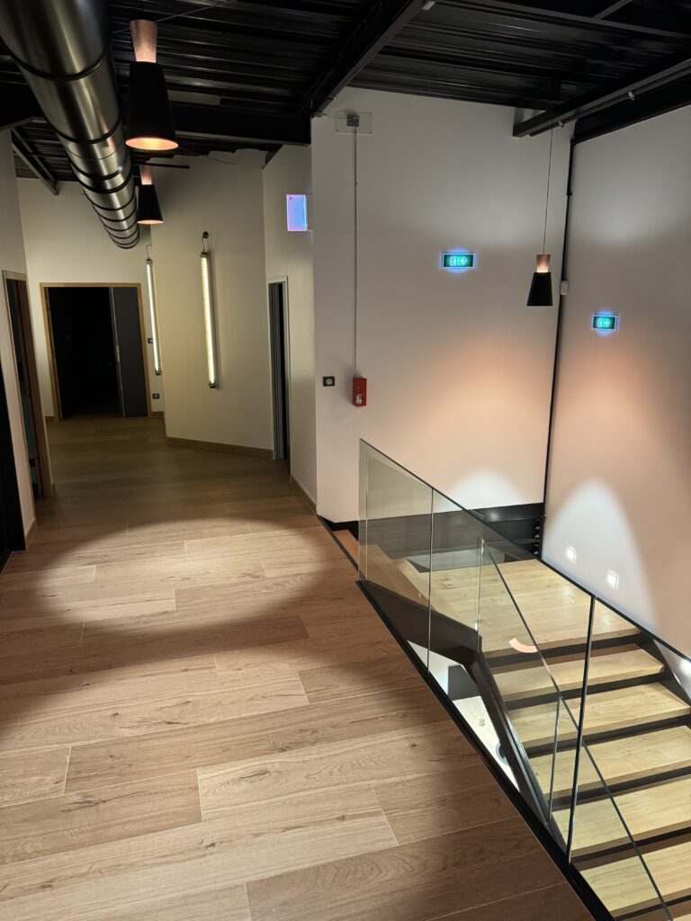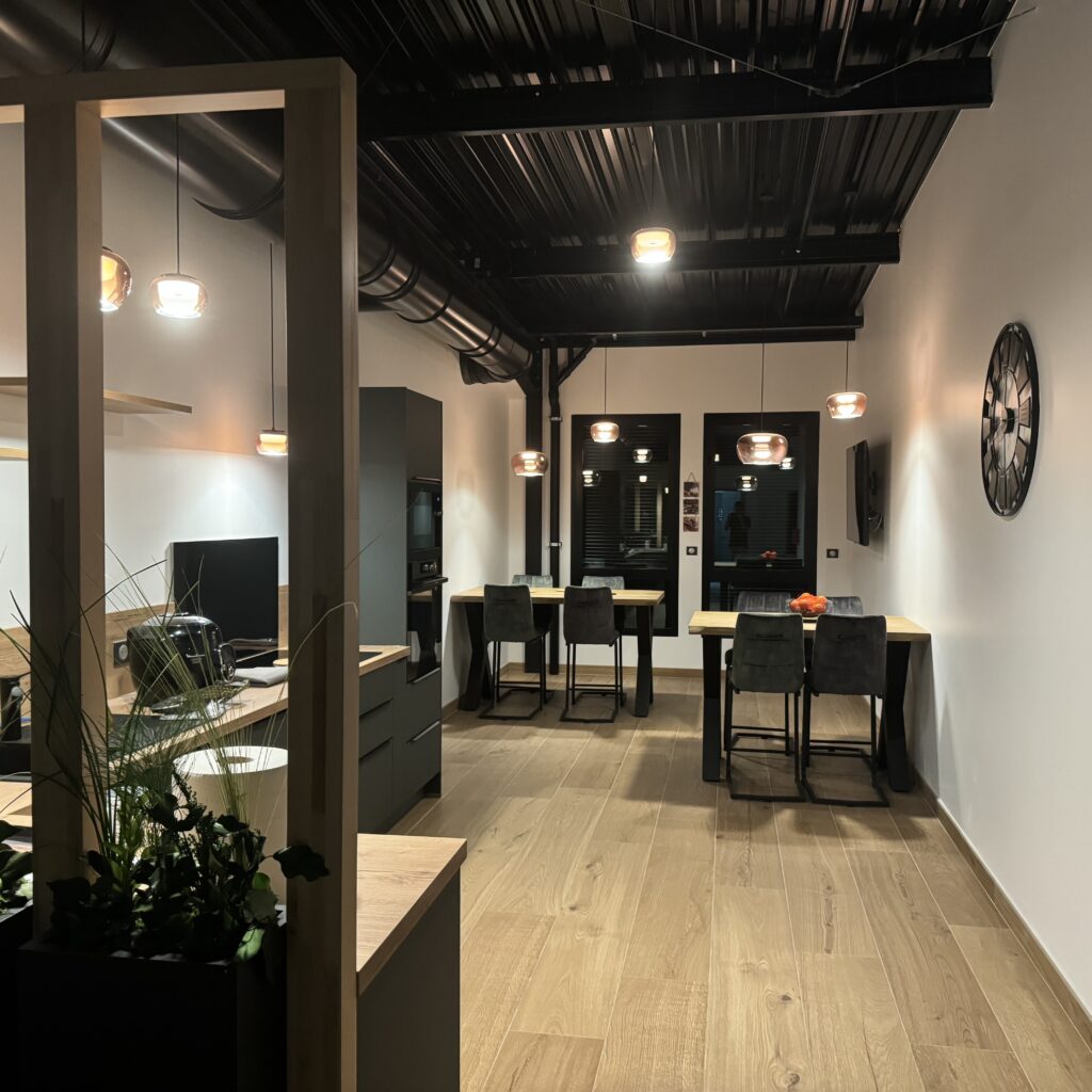 Au premier étage, le plafond en métal noir confère une esthétique industrielle tandis que les éléments en bois ajoutent une touche naturelle, créant un contraste de style. Les luminaires en bois sur mesure, conçus spécifiquement pour chaque espace, apportent un éclairage subtile et personnalisé à cette réalisation.